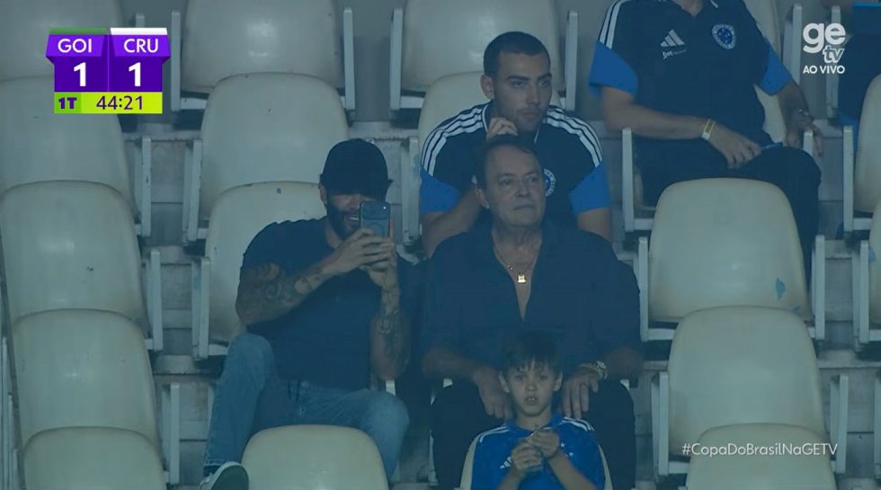 Ao lado de Pedro Lourenço, dono da SAF do Cruzeiro, o cantor Gusttavo Lima marcou presença na partida da Raposa contra o Goiás, no Estádio Serra Dourada, pela Copa do Brasil.